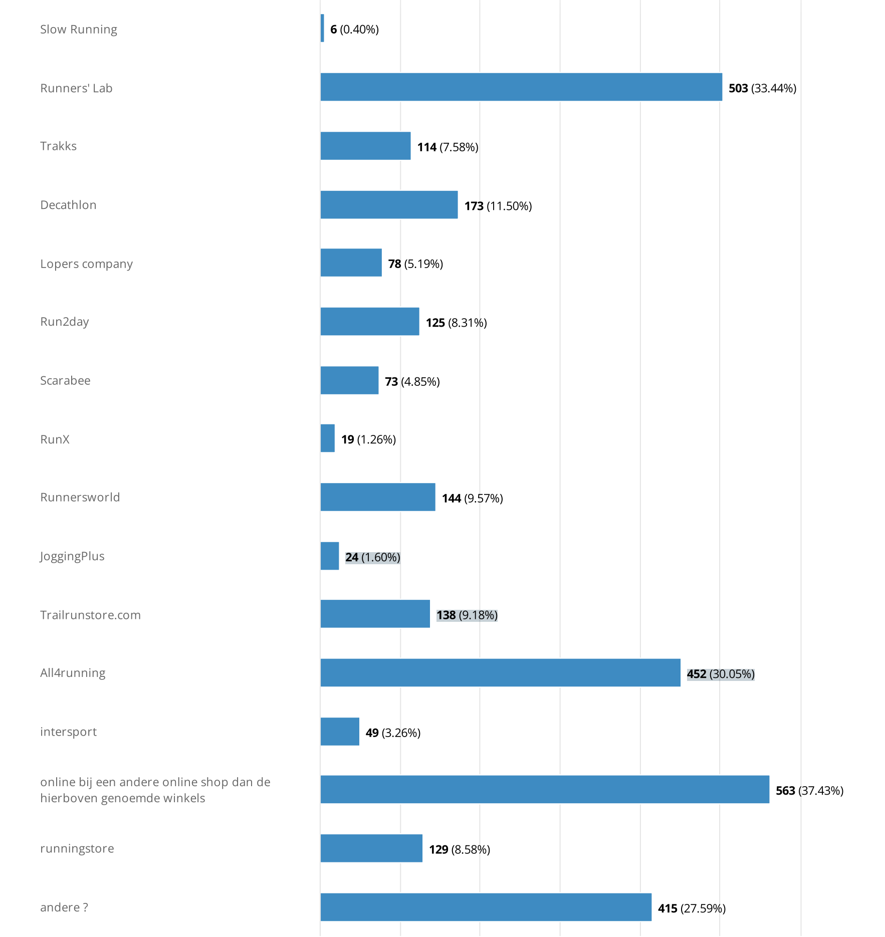 De antwoorden tonen een duidelijke dominantie van enkele grote spelers: Hoka (481), Asics (442) , Saucony (341), Brooks (340) en Salomon (314) zijn veruit de meest gedragen merken.