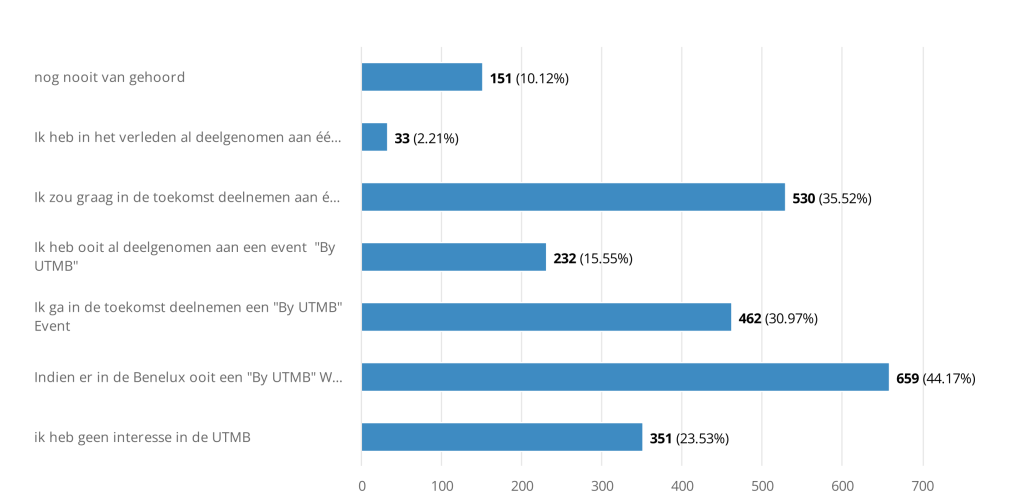 Meer dan 50% is van plan om tussen de 3 en 5 georganiseerde events mee te lopen. 30% loopt er max 10 en 10%, de echte trailjunkies lopen er jaarlijks meer dan 10.