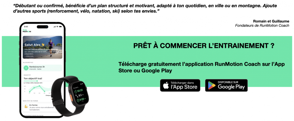 RunMotion Coach est votre partenaire d’entraînement personnel dans votre poche. Cette application intelligente élabore en quelques minutes un plan d’entraînement entièrement adapté à votre niveau, votre expérience, vos ambitions et votre emploi du temps. Développée par des coachs experts, des spécialistes du sport et avec l’aide de l’intelligence artificielle, RunMotion propose un programme personnalisé pour relever tous les défis. Et après ce trail ? Lancez-vous directement dans la préparation de votre prochain objectif !